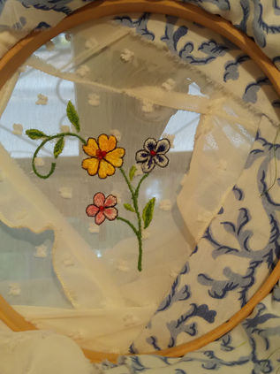 Aprenderá a bordar mirando como la aguja dibuja en el aro, sin darse cuenta… Las primeras labores en el colegio de las Madres Teatinas. La máquina empezará a manejarla con doce años. A los catorce años, finalizado el Bachiller Elemental, será cuando sus tías, las maestras del Taller, y las monjas Dominicas del Convento de la Encarnación de Almagro le empezarán a pasar algunos encargos. Encargos que su madre le preparará, dibujando y sacando hilos, y que bordará durante las vacaciones. El poco dinero que se ganará será para sus gastos (su primera máquina de escribir y las telas para su dote).